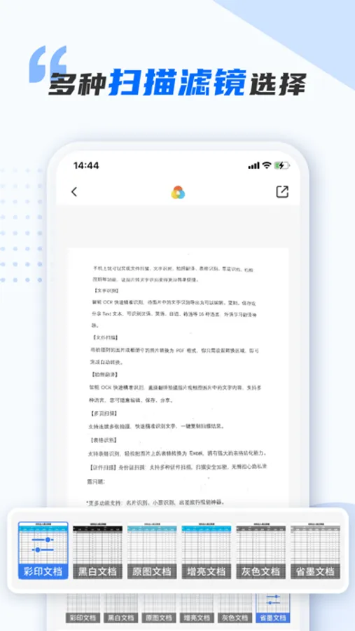 -扫描识别各种文件、图片、书籍、名片等并提取文字,可对识别的内容进行编辑、复制、校对