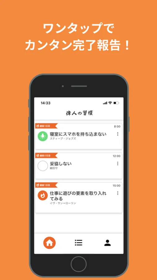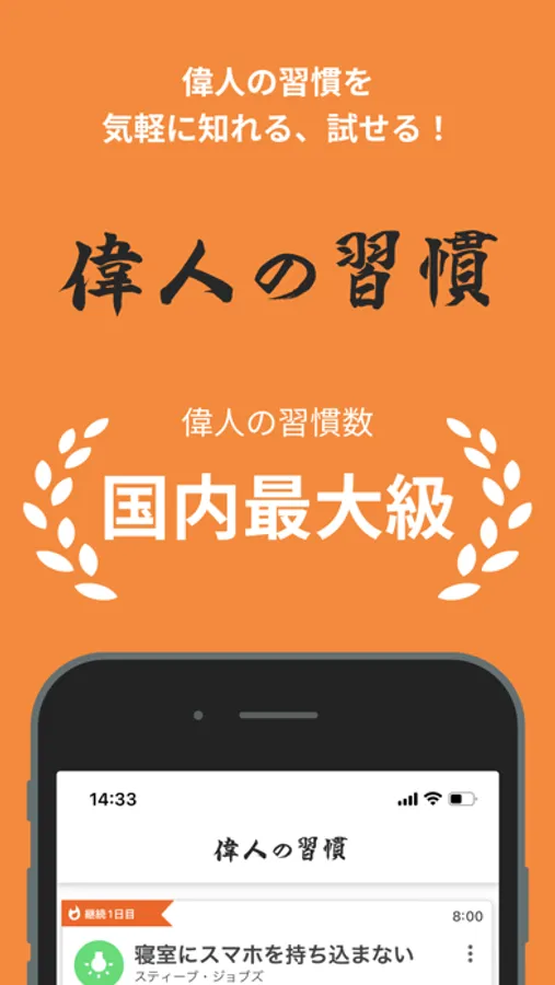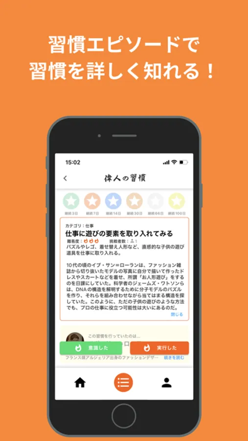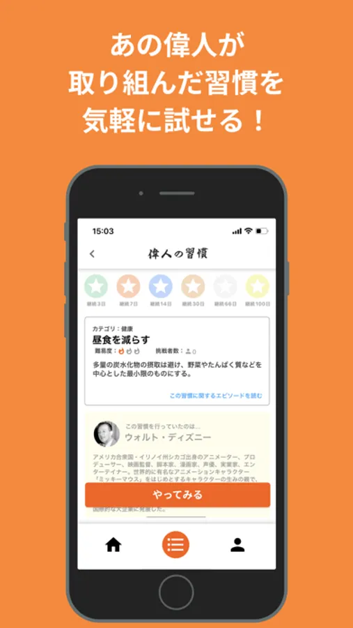 ① ワンタップでカンタンに偉人の習慣を知れる!、試せる!