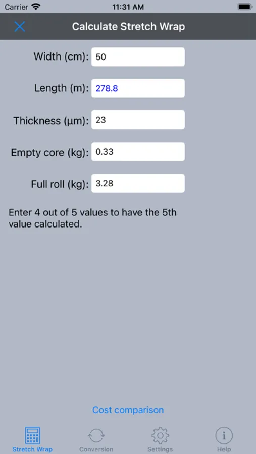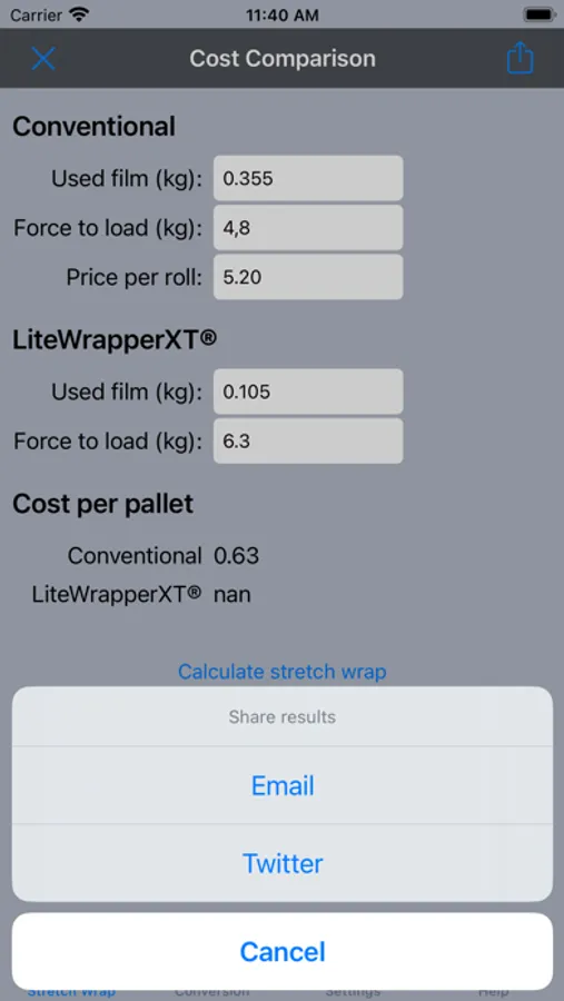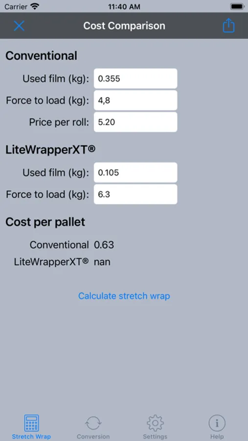 After weighing the film used to wrap your pallet and entering the price you paid for one roll, the app will show you the real material costs of wrapping your pallet.