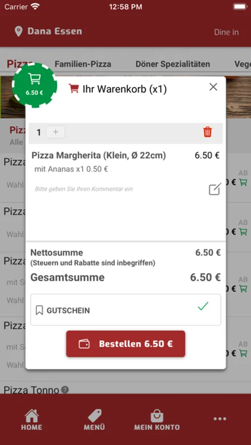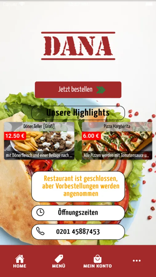 Herzlich Willkomen bei Dana in Essen. Wir bedienen unsere Kunden mit Italienische Pizza, Döner, Pasta Speisen und machen das seit mehreren Jahren aus Leidenschaft. Wir freuen uns immer wieder neue Kunden unsere Herkunft näher zubringen und möchten ihnen die Möglichkeit geben, ihre Bestellung unkompliziert und total einfach abzugeben. Aus diesem Grund, möchte wir ihnen unsere neue App und unseren Online Shop vorstellen, mit dem Sie problemlos über Paypal, Bar und Kreditkarte zahlen können.