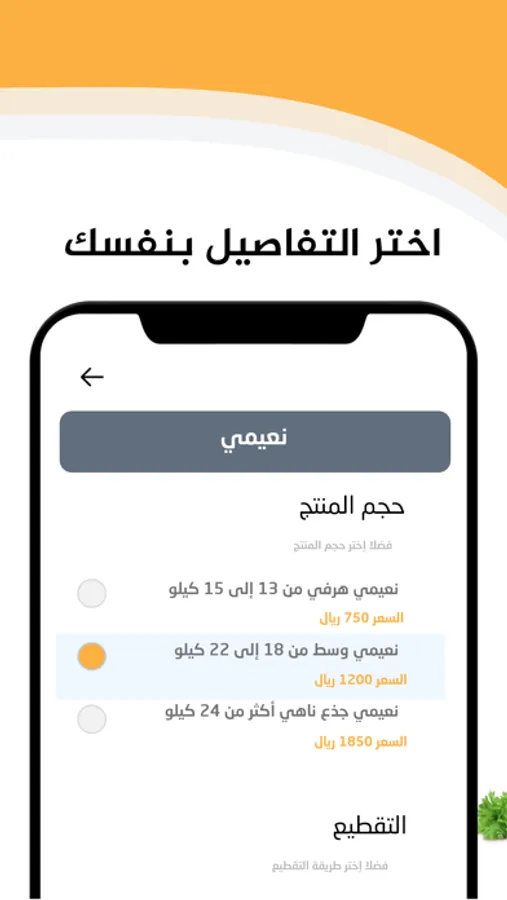 يمكنك اختيار أنواع الذبائح وأحجامها وطريقة تحضيرها او تغليفها واختيار طريقة الدفع التي ترغب بها.