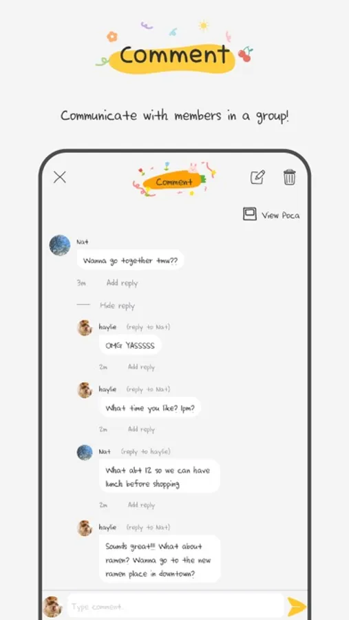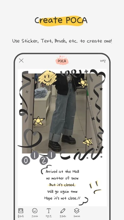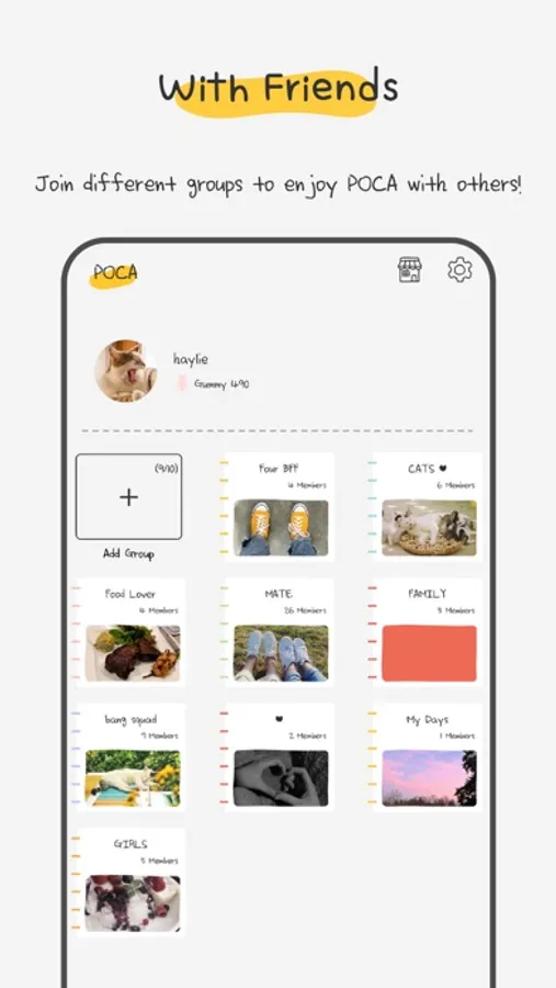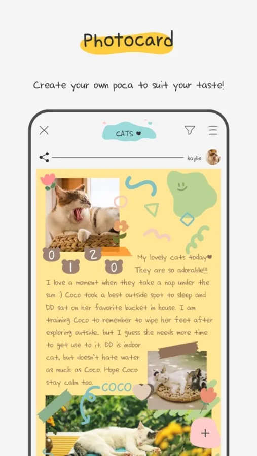 Create poca (photocard) with cute stickers and various layouts! You can decorate your favorite celebrity or your daily life. Invite friends to a group and share the day with them.