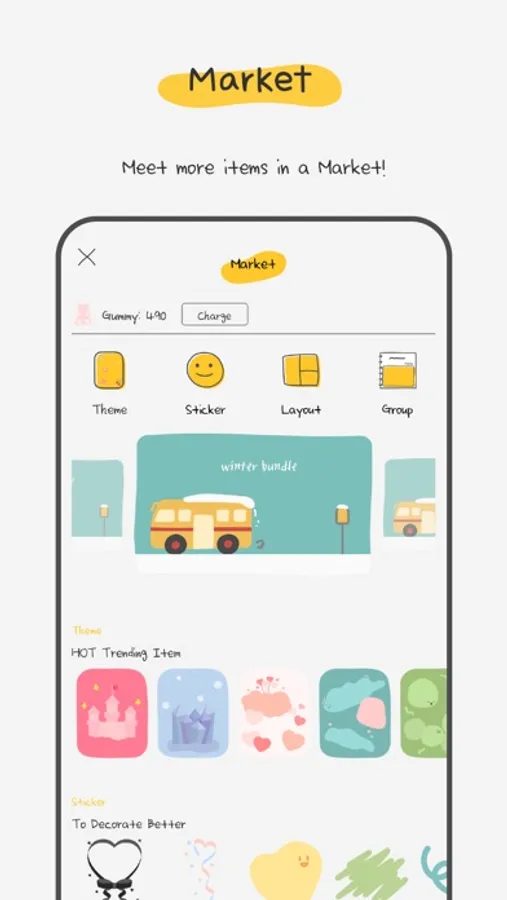 Other than free items, you can purchase theme/sticker/layout/group with gummy in a market. If you want to decorate poca with more various items, try this market feature.