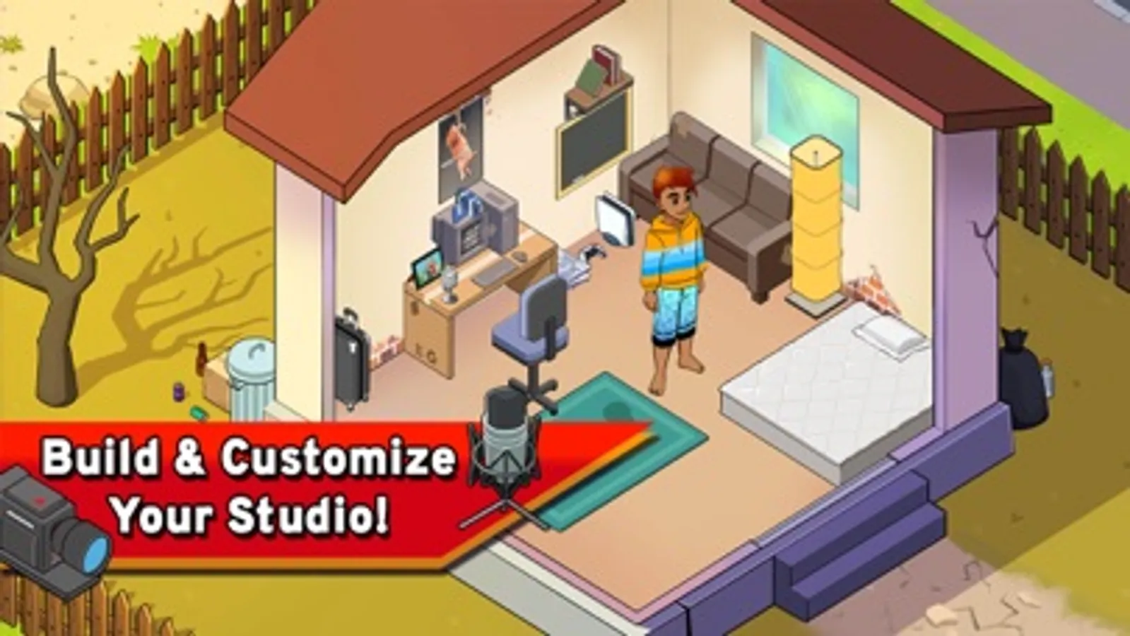 Start in a small house with not much but a couple of walls and a simple setup. But once you make your first video, a whole new world will open up to you. You'll earn views, subscribers, and money to unlock and buy upgrades to equipment, clothes, awards, wheels, and houses as you grow. You might want to move into the luxury villa once your ad revenue allows you. And that is just the start!