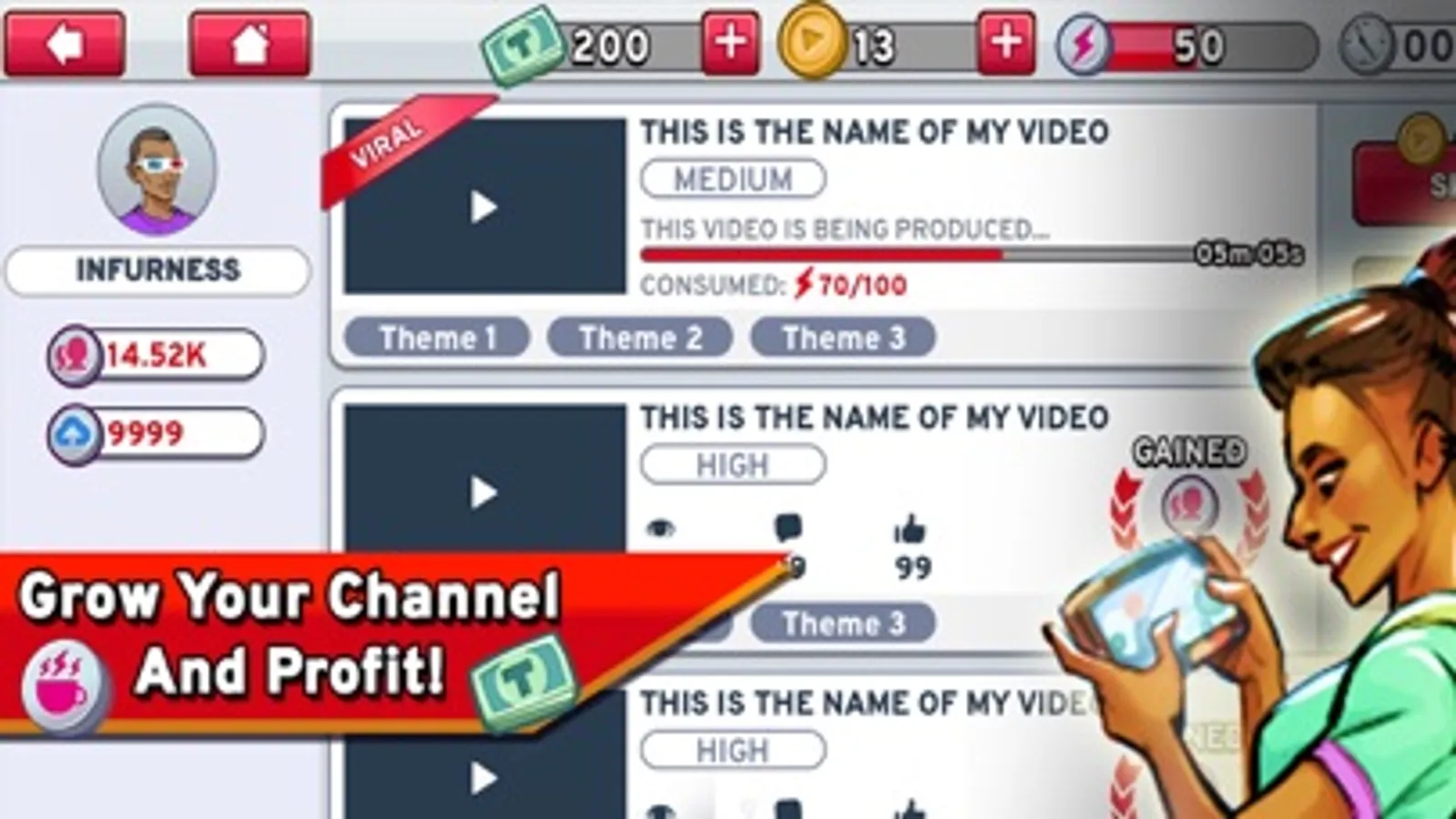 Earn fame and respect as you work your way to becoming the top Tubiter! You might gain sponsorships and brand deals along the way for some extra dough on the side. Want a Lambo from Tube money? How about starting a whole company from your channel? It all begins here.