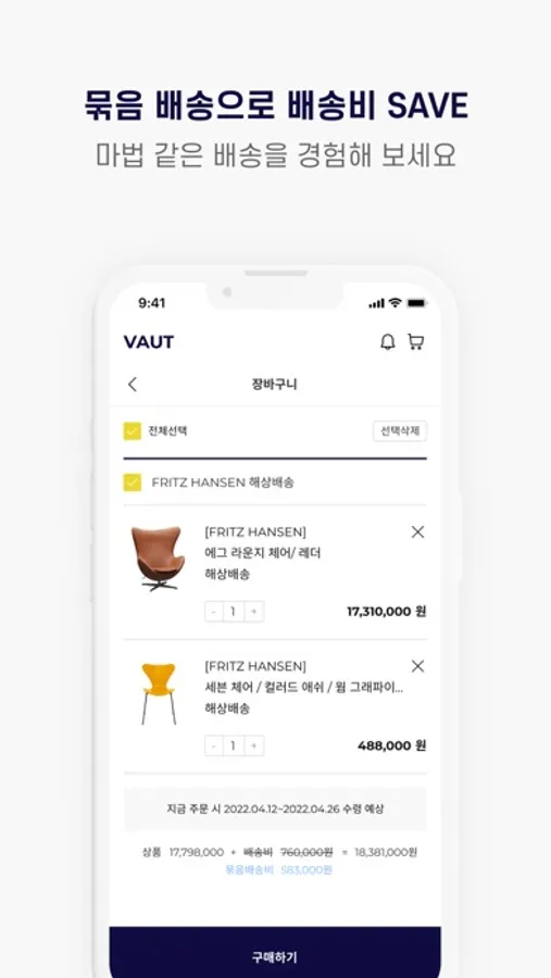 상품 수령 즉시 발생한 문제는 한달 내 A/S가 가능합니다. 국내 명품가구 A/S센터 혹은 현지 업체에서 서비스를 진행하며, 이 모든 과정을 바우트가 함께 도와드립니다.