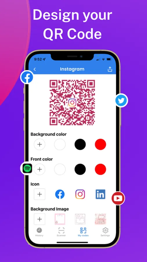 - Create social QR codes like Facebook, Instagram, Twitter, Spotify, Youtube, LinkedIn etc...