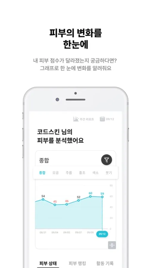 스킨로그는 피부 상태를 수치화하고 그래프로 나타내어 내 피부의 과거, 현재를 쉽게 파악할 수 있게 도와드립니다.