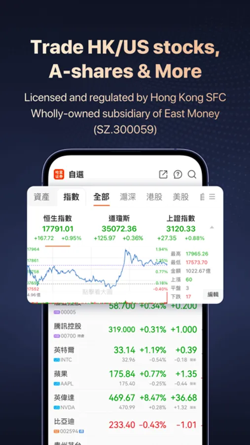 Hafoo is a global investment platform which is a wholly-owned subsidiary of East Money Information Co. (SZ.300059), a leading internet broker. Hafoo is regulated by the Hong Kong Securities and Futures Commission and is a member of the London Stock Exchange and the Turquoise Platform. Join Hafoo instantly and experience a secure and professional investment app that empowers you to easily navigate the world financial market.