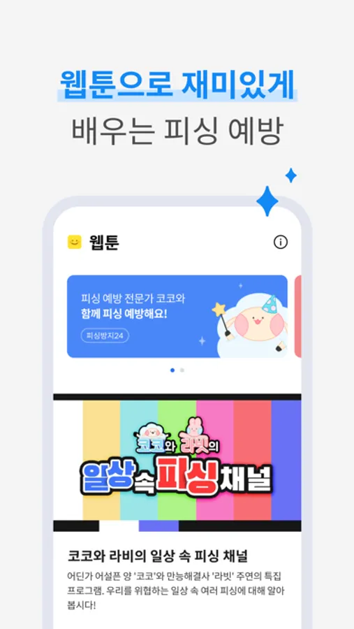 피싱 예방 전문가 코코와 라빗과 함께 웹툰으로 다양한 피싱 수법에 대해 배우고 함께 예방해요.