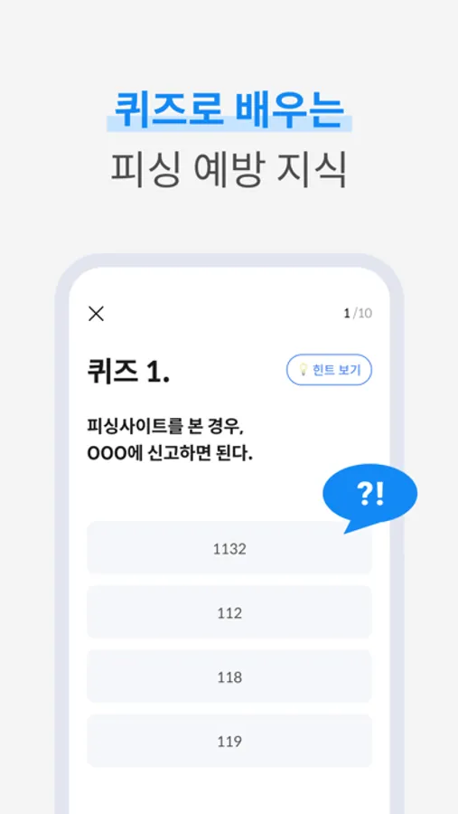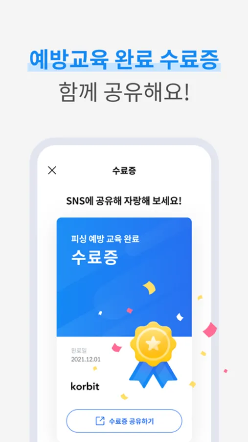 교육 콘텐츠와 웹툰에서 배운 내용을 토대로 피싱 예방 퀴즈를 풀고 수료증을 받으세요.