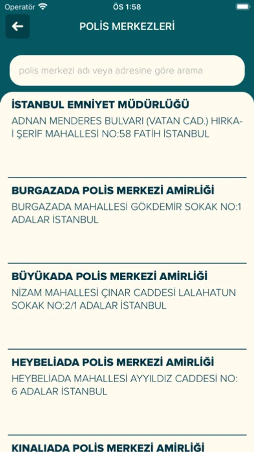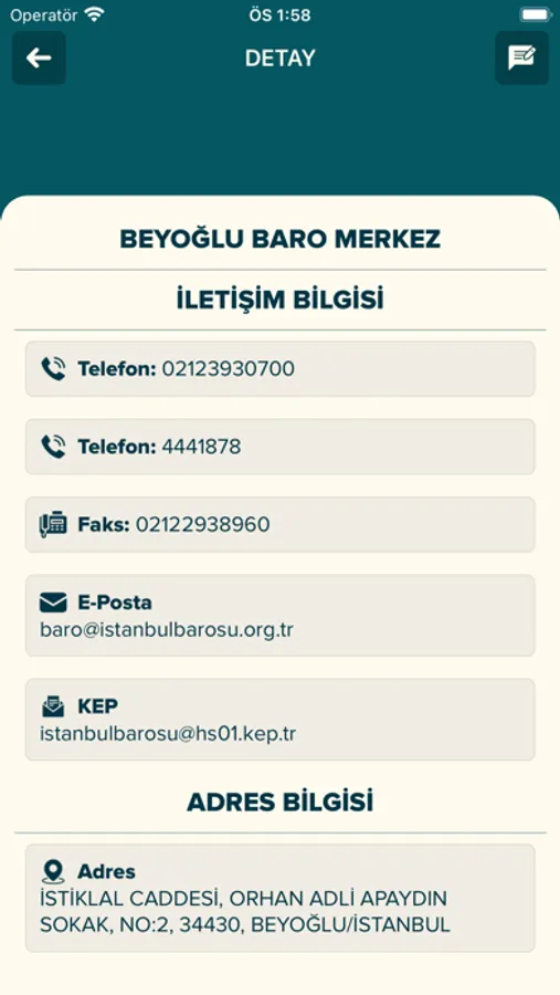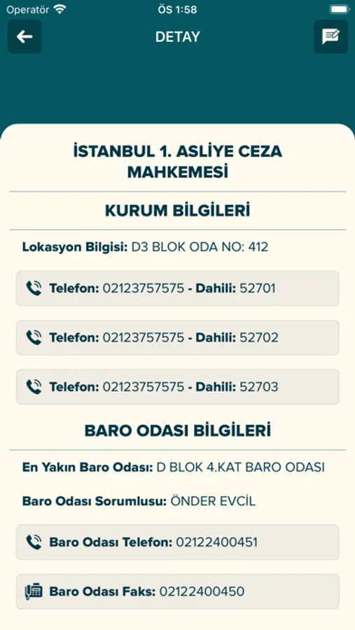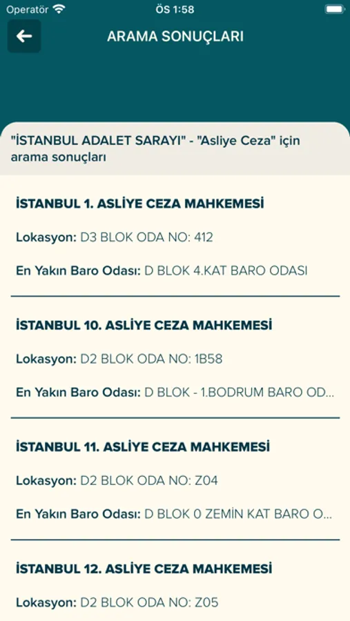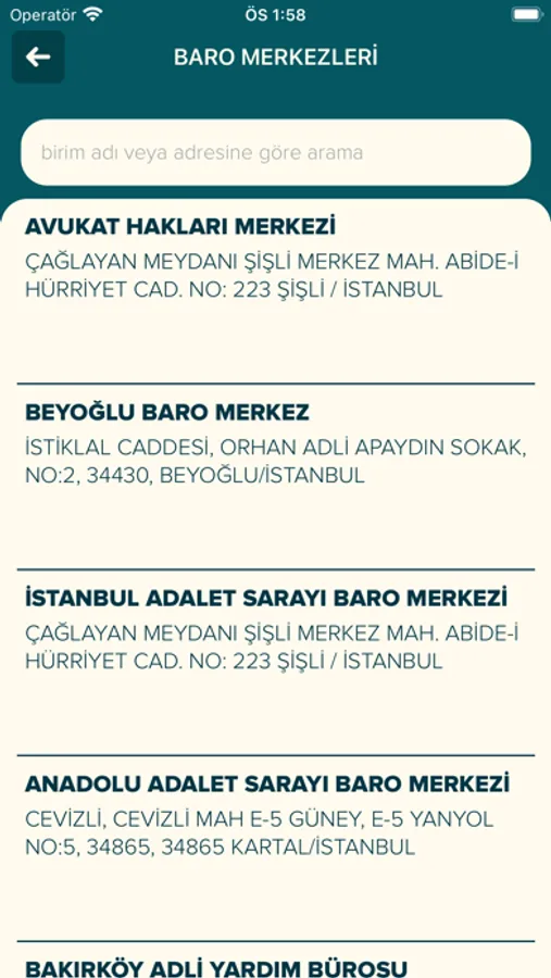 İstanbul'da bulunan mahkeme, noter, cezaevi, polis merkezi ve İstanbul Barosu birimlerine ait güncel iletişim bilgilerinin bulunduğu uygulamadır.