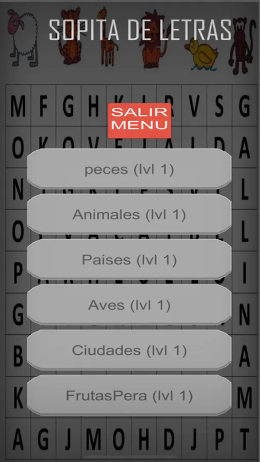Cuenta con una variedad de sopas de letras agrupadas según su tema o categoría: peces, ciudades, países, etc