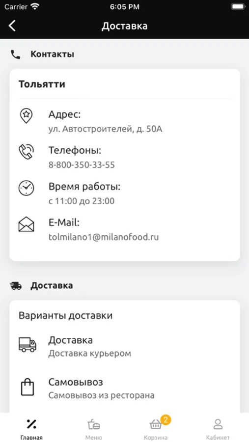 Ежедневно доступен самовывоз любых позиций меню. Адрес точки: ул. Автостроителей, д.50А. За получение заказов клиентом у себя дома отвечает служба доставки «Есть». Оплатить блюда можно заранее, заполнив платежную форму онлайн, либо по факту получения. Способы расчета: наличные и банковские карты.