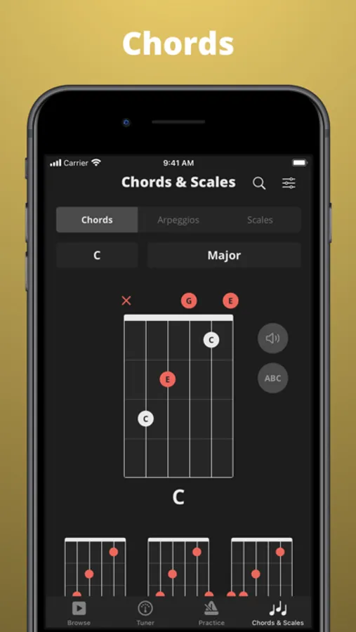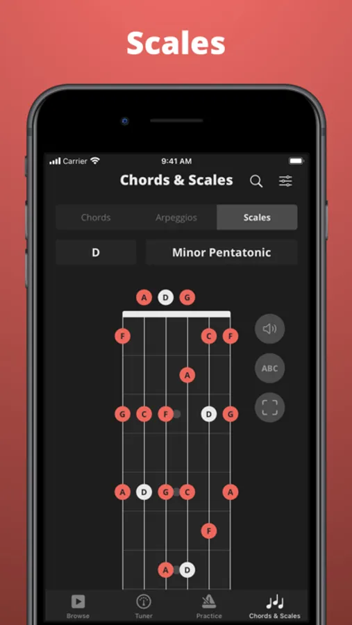 Search for any chords by name or shape and see all the voicings for those chords. Choose between chord views for chord fingering, note names or intervals so you can easily learn the relationships between the notes. See and hear full fretboard arpeggios for any chord in the library. Learn scales with our interactive fretboard, allowing you to see and hear the relationships between each note.