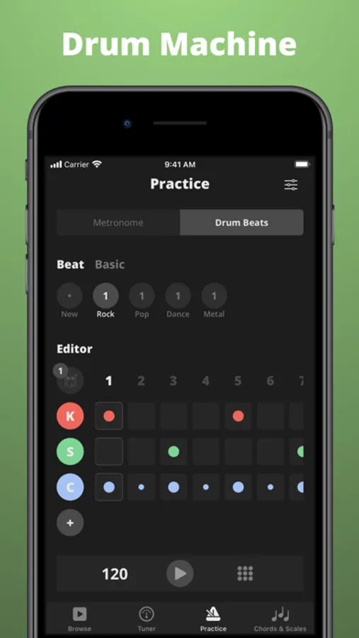 Use our fully programmable drum sequencer to jam and practice. The tool comes loaded with 8 great drum kits to choose from, but you can also program your own beats.