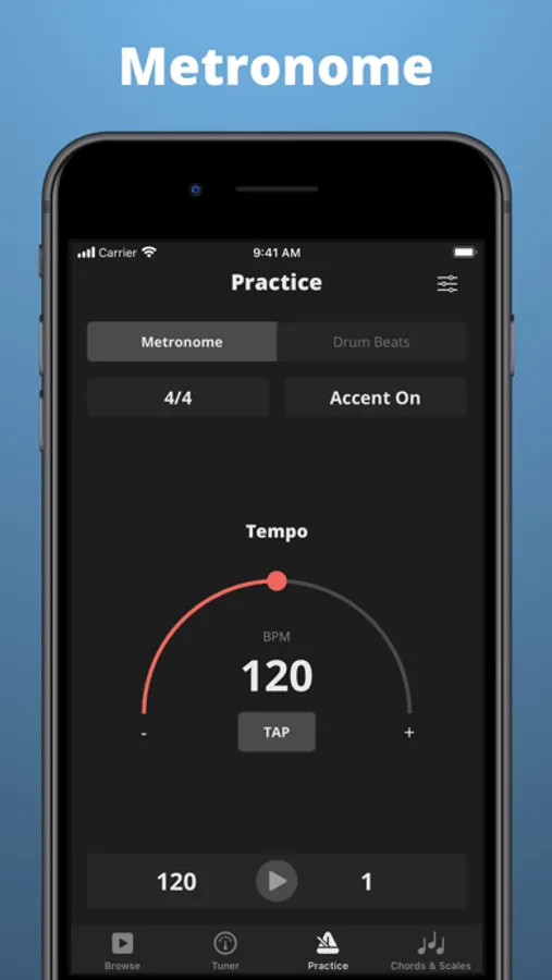 Keep the rhythm with our metronome! Choose the tempo, time signature and accents with our very simple and intuitive controls.