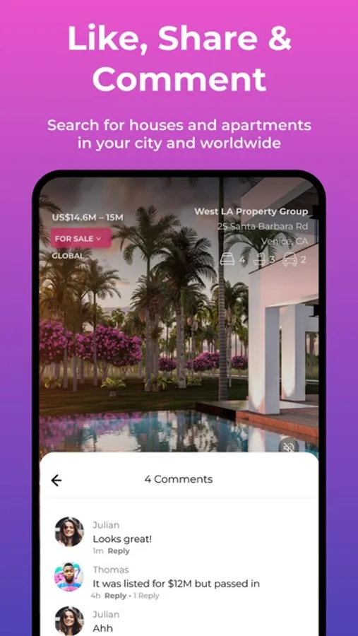 Shoot short videos on the spot with your phone and 1060. Add music, then post live instantly to home buyers, renters in your city and worldwide. Get instant chats.