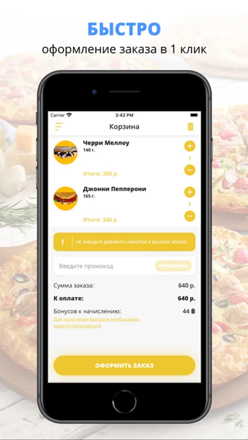 Скачивайте наше приложение, оформляйте заказ и наслаждайтесь любимой едой, где бы Вы ни были! Приятного аппетита!