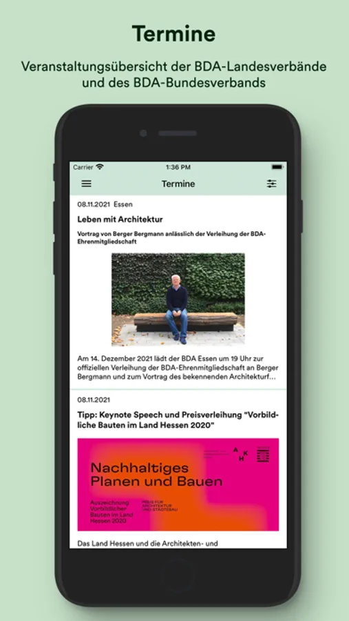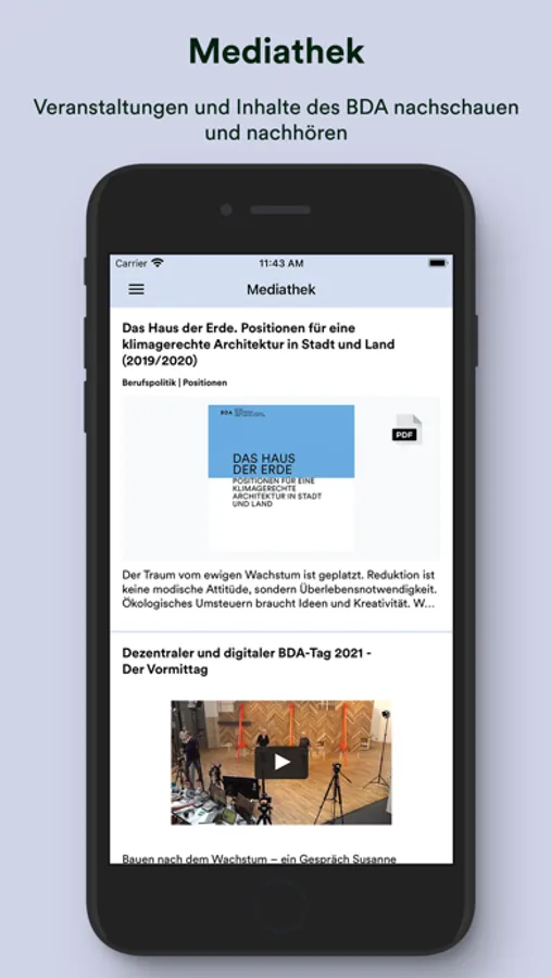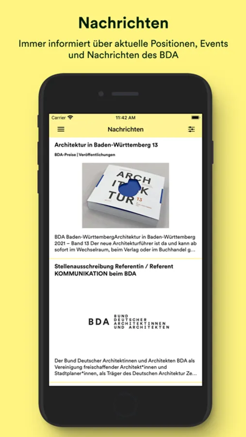 Beteiligen Sie sich an Debatten, Veranstaltungen und Terminen des Bundes Deutscher Architektinnen und Architekten BDA. Finden Sie unsere aktuellen Publikationen und Positionen im Volltext und rufen Sie unsere Videos und Podcasts ab. Die BDA-App ist kostenlos und ohne Registrierung zugänglich