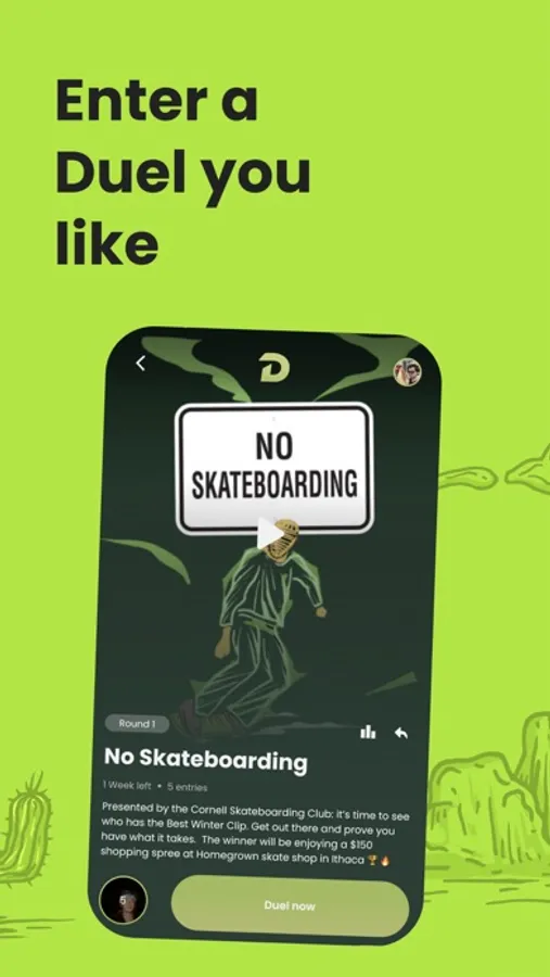 Whether you're a content creator or a content enjoy-er, Duel is built to level up your content experience. Find something you're interested in and get involved by entering or scoring your fellow Duelers. Duels start and end on a clear schedule. No more infinite scrolls that lead nowhere. No more scrolling for the sake of scrolling. When a Duel is over, that's it. You can move on with your day, or pick the next Duel that interests you.