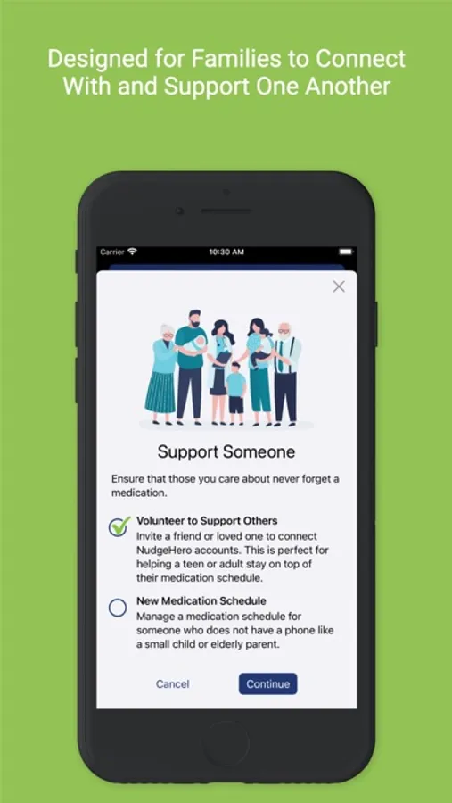 FAMILY CONNECTIVITY and SUPPORTER FUNCTIONALITY allow you to manage meds for your entire family from one console … and to support family members as a backstop if they ignore all reminders.
