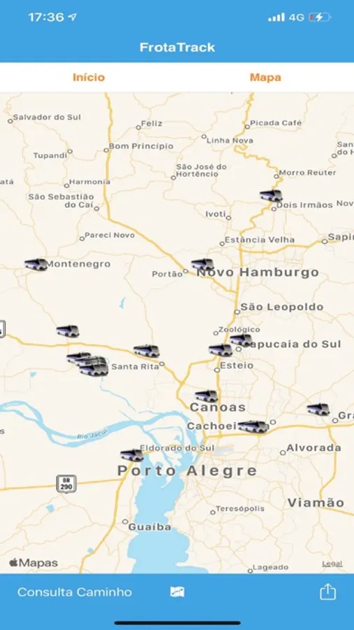 O aplicativo FrotaTrack lista todos os veículos rastreados e permite ao gestor consultar trajetos realizados, consultar e compartilhar a localização dos veículos.