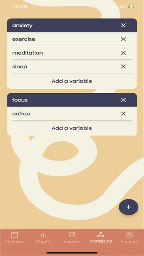 3) Navigate to the Variables tab and click the button to add your main variables. You can create variables for everything you want to track, for example Mood or Anxiety. You’ll be prompted to add a minimum and maximum value (for example 0-10).