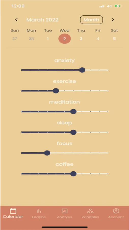 5) Following this you can navigate to the Calendar tab and use sliders to record the values for your variables each day.