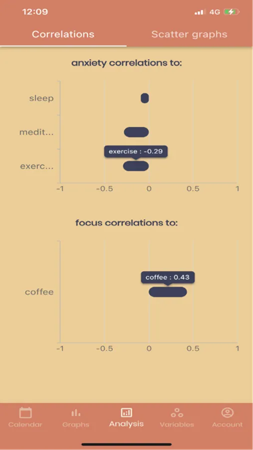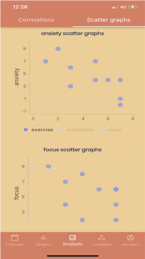 6) Once you’ve started to track your data, you can head over to the Graphs tab to view charts of your variables over time. The Analysis tab means you can visualise correlations and view scatter graphs to gain deeper insights!