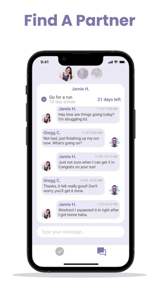 Habits are easier to build with a partner to support you. That's why Upward lets you request a partner who is working on the same habit you are. For 21 days you'll be able to chat with your partner, see their status and streak for the day, and support each other in staying consistent.