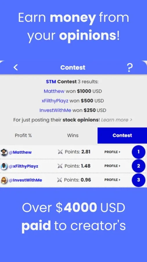 You don't need to be a portfolio manager to monetize your stock opinions any longer! Any person can utilize their trading ideas and compete against each other! We want to create an environment where we use objective statistics to let the most profitable trader win prizes!