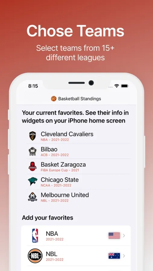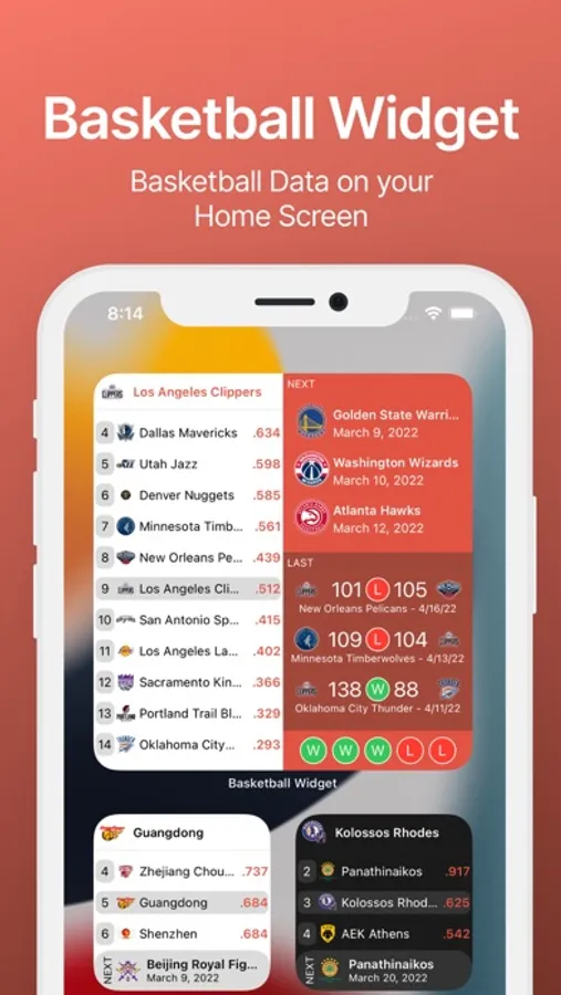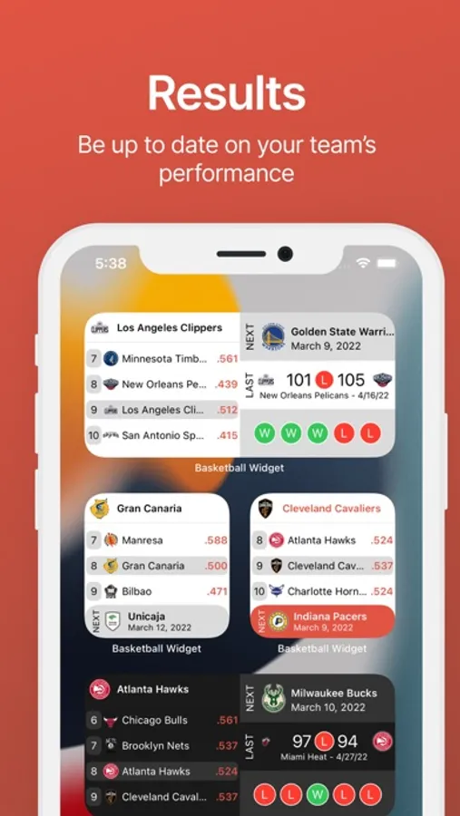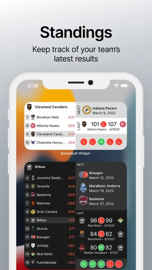 View standings, matches and scores of your favorite basketball teams on your home screen or lock screen in a widget!