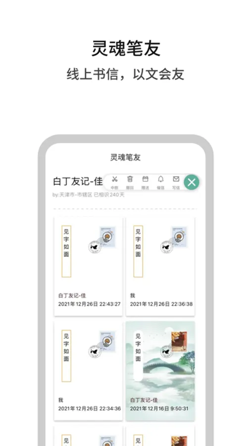 对于线上的笔友,我们模拟现实通信,根据不同使用需要设置了邮票的寄送时长,而且提供不同风格的邮票、信纸和信封,并且每月都有相应更新,如果你有收集的习惯,不妨从这里开始。