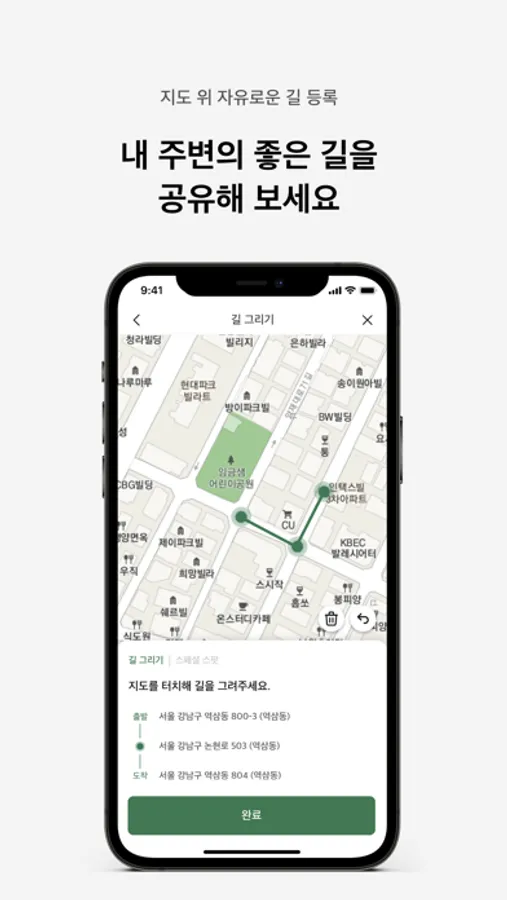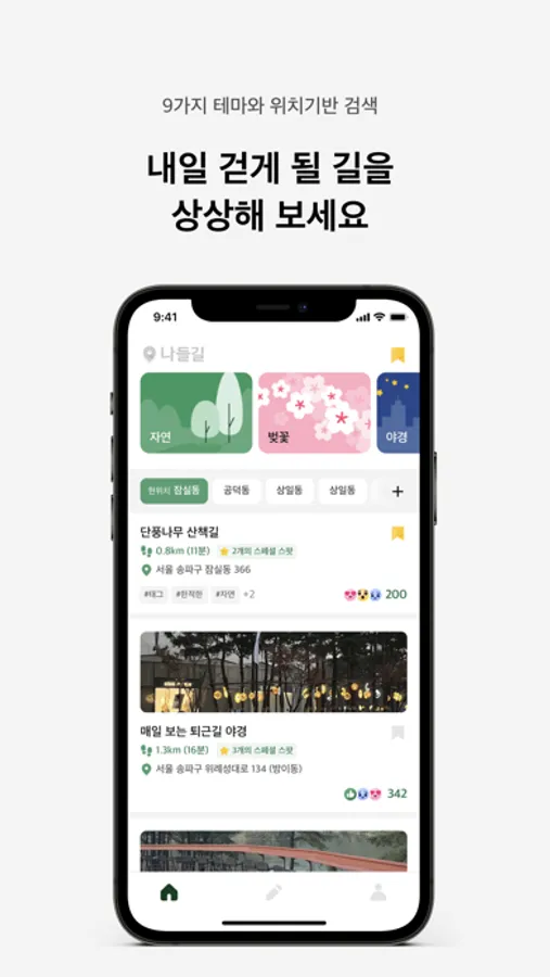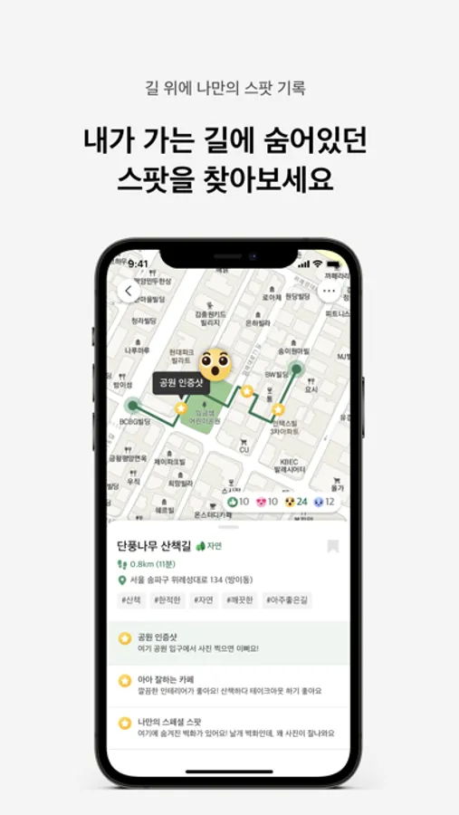 익명 아이디로 나의 추억들을 저장하고, 산책길 정보를 공유할 수 있습니다.