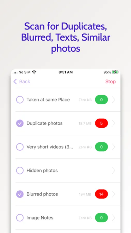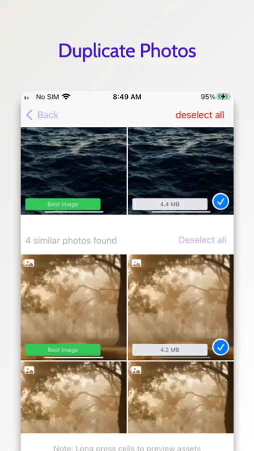 Remove duplicate photos, similar photos, screenshots, blurred images, defocused videos, short videos, image notes using this app. Cleanup your device and free up additional spaces.