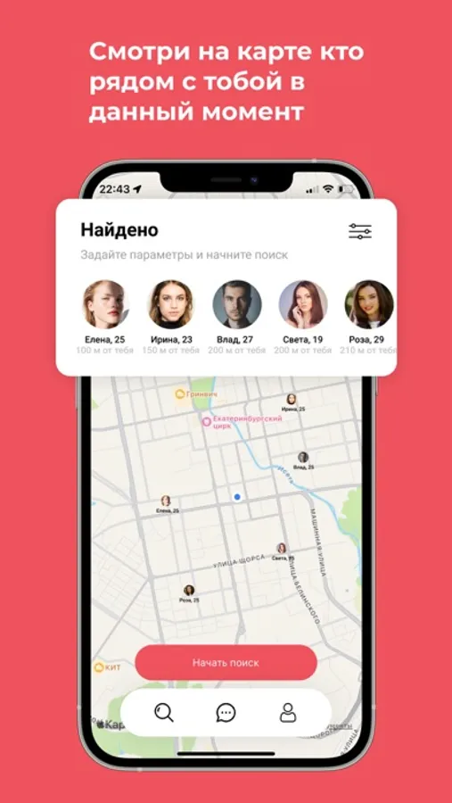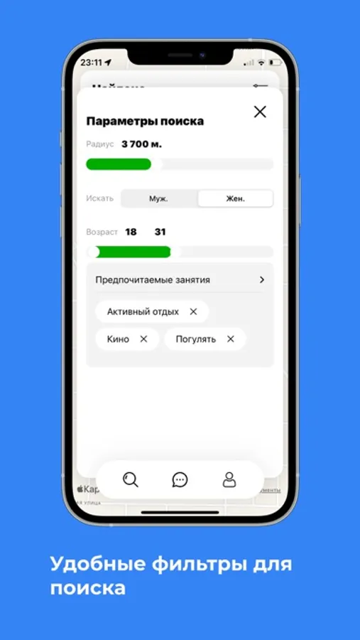 Смотрите на карте кто сейчас рядом с вами, а при помощи доступных фильтров находите именно тех, с кем вы хотите встретится именно сейчас. Доступен поиск по предпочтительным занятиям, например, вы хотите пойти в кино, вы можете выстроить поиск так, что бы найти всех в радиусе от 100 до 10 км, кто в данный момент ищет тоже, с кем пойти в кино!
