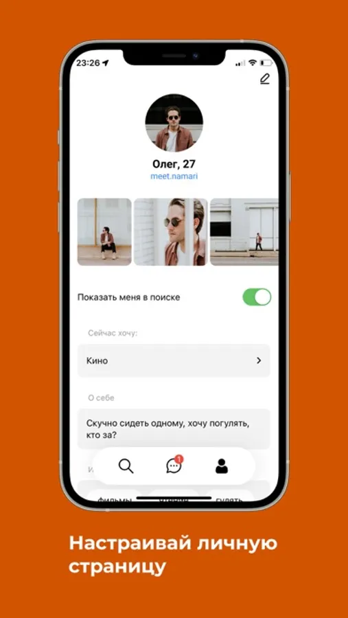Настраиваете свою личную страницу, загружайте основную фотографию и три дополнительных, размещайте информацию о себе, добавляйте свои интересы, а главное, вы можете выбрать то, чем бы хотели заняться прямо сейчас, именно по нему вас могут найти те, кто бы хотел сейчас заняться тем же самым!