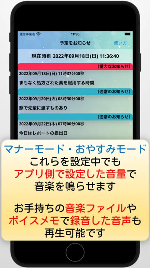 おやすみモードやマナーモードに関係なくアプリ側で設定した音量で曲が再生、通知されます。