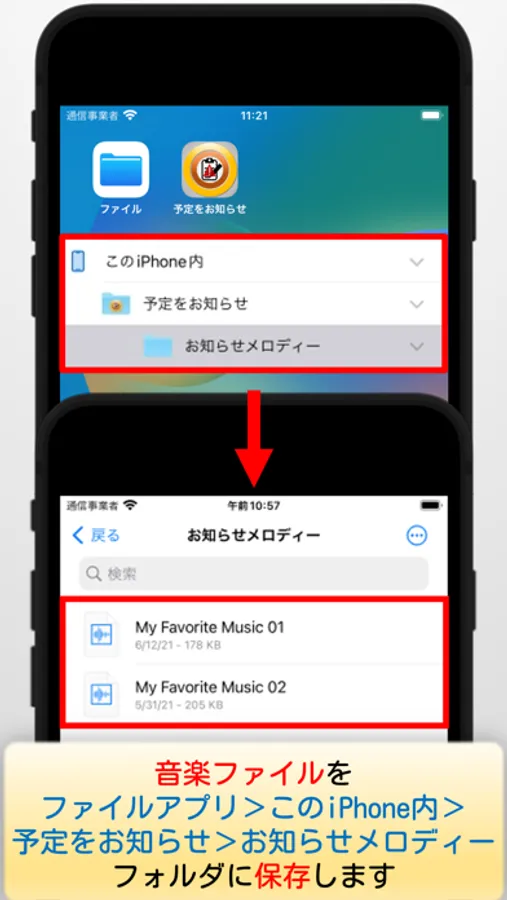 指定フォルダは、Appleのファイルアプリ>このiPhone内(iPad内)>予定をお知らせ>お知らせメロディーです。