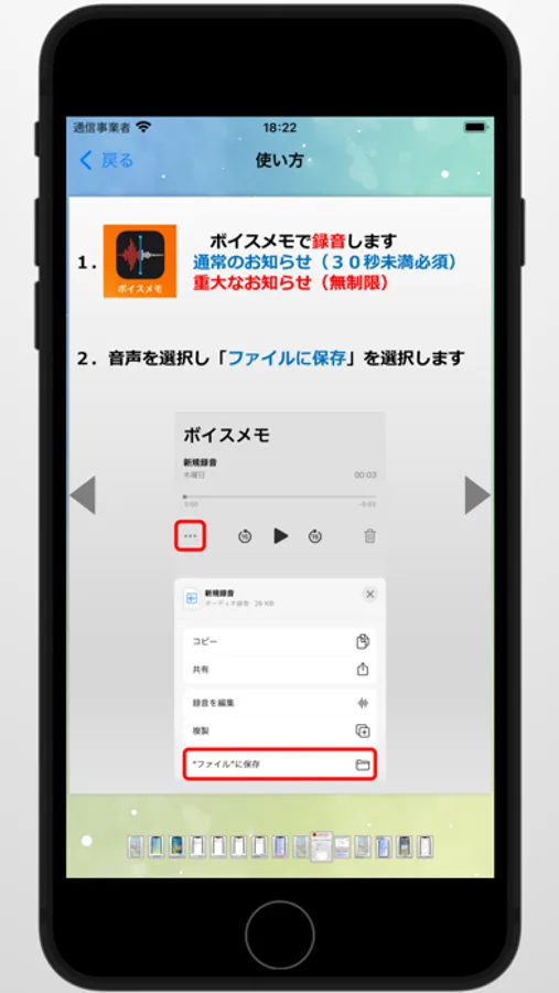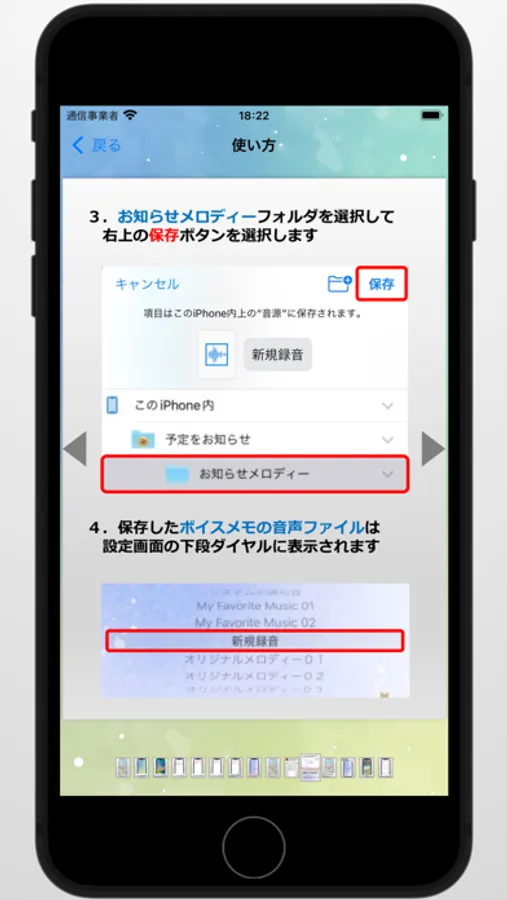 ボイスメモで録音した音声なども上記と同様に指定フォルダに保存、選択することも可能です。