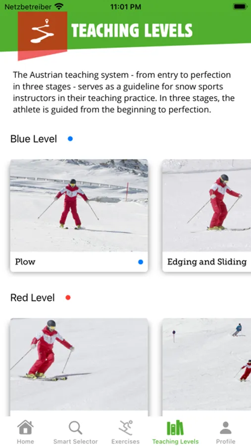 The Austrian Ski Syllabus of the Naturfreunde Austria is also displayed in the app, reflecting the path to skiing from the blue to the black slope.