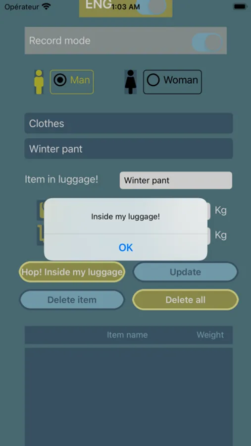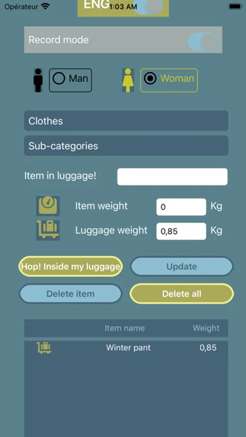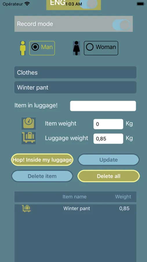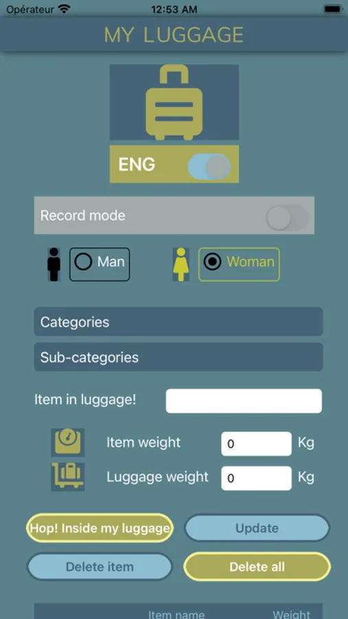 My Luggage List allows to edit and maintain a list of items you want to put in your luggage when you plan to travel. The app provides you the estimated weight of your virtual luggage based upon the estimated and normative individual weight of each selected items. Several lists and choices as well as the possibility to edit the item description allow you to build up a customized list. You can register your list on your Iphone memory and retrieve it later and edit. You can add, delete or amend the recorded items. Get a weight estimate of your luggage and keep a comprehensive list of items on your Iphone!