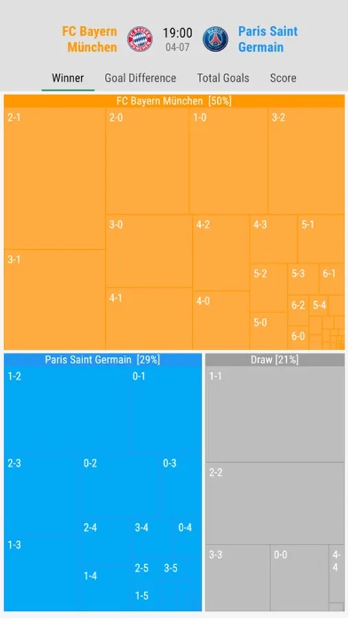 - Tree-map chart demonstrates winning probabilities by rectangle area.