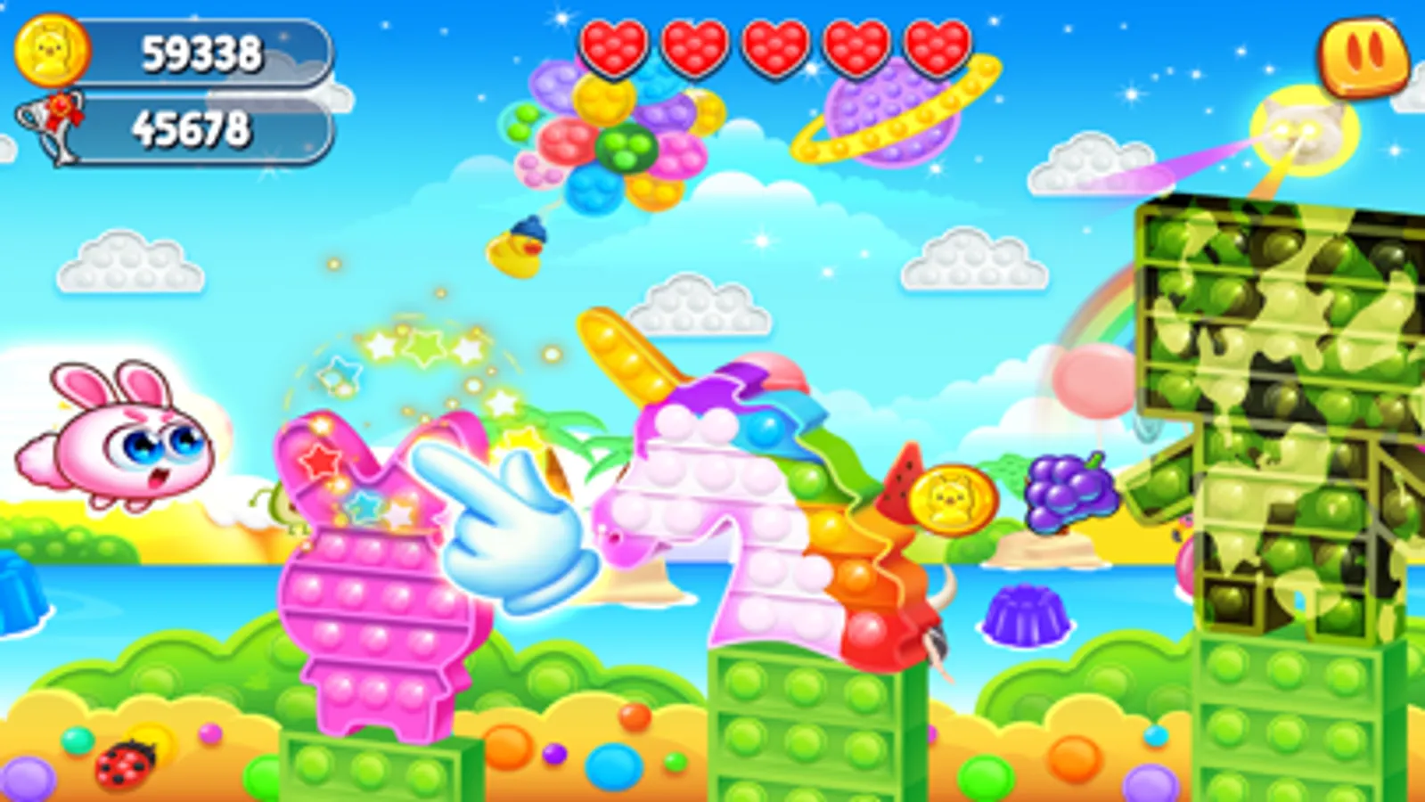 Pop Fidget Toy towers down for Character to Fly through the World! If Character hits Pop It tower before Popping Bubbles down, lose a life and restart. Intuitive one hand control.