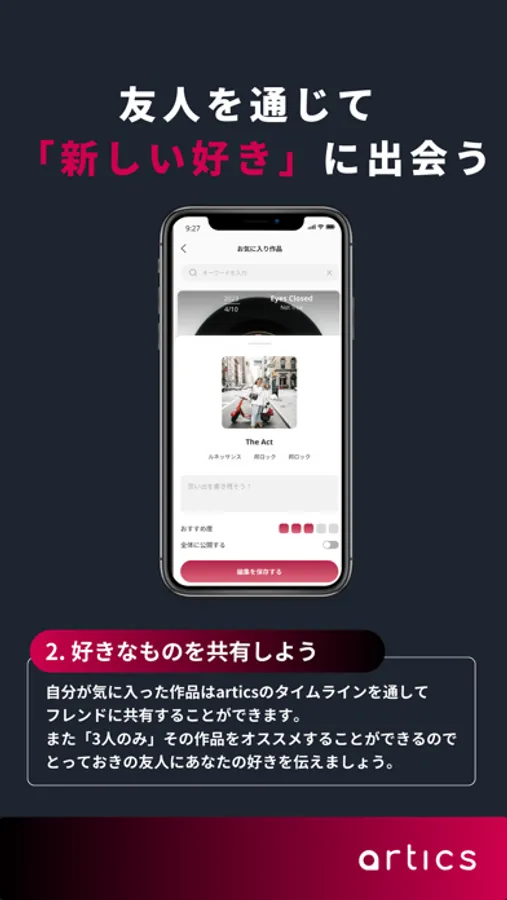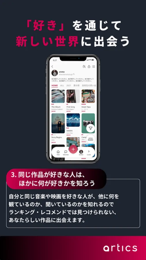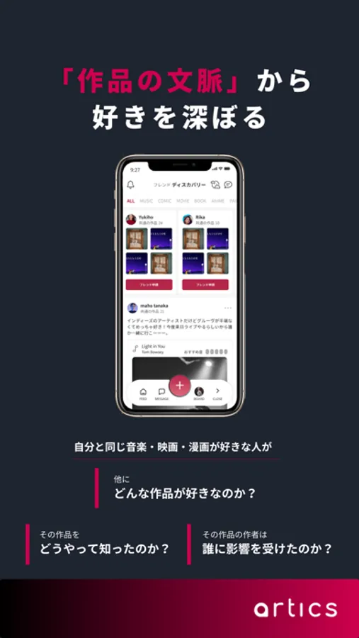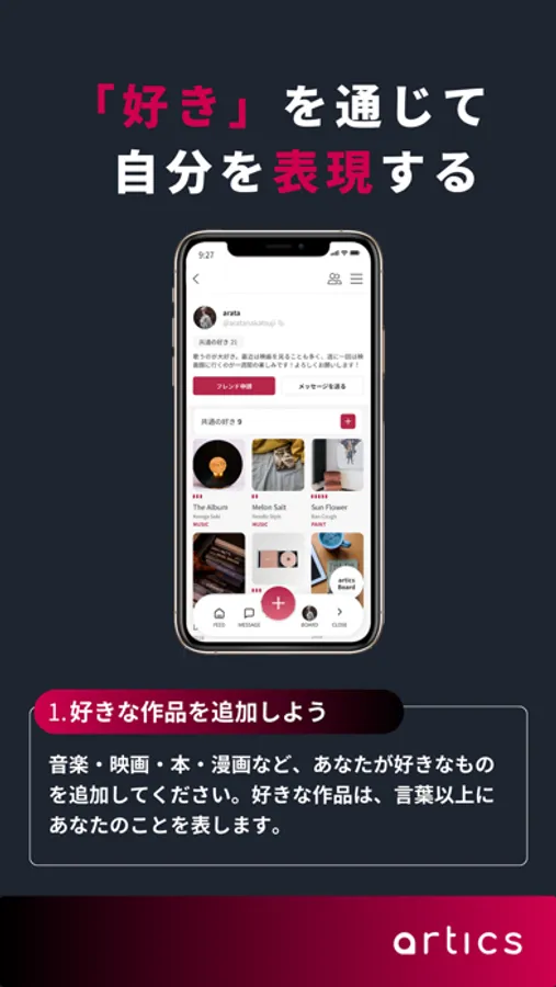 ”artics”では追加した作品を通して、共通の趣味を持つ友達や、自分と似た好みを持つアーティストと出会うことができます。