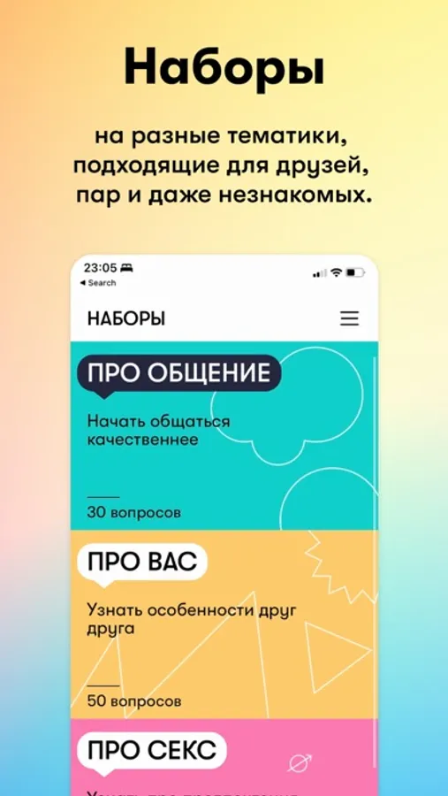 Наборы с вопросами для построения откровенного диалога. Это подходит для друзей, пар, компаний и даже незнакомых людей. Поможет сблизиться, узнать человека с другой стороны и границы в общении.