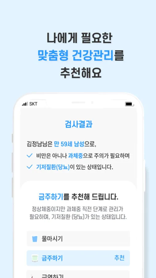 간단한 설문을 통해서 맞춤형 건강관리를 추천해드려요! 건너뛰지 마시고, 설문을 완료하면 더 정확한 레포트를 받을 수 있답니다:)