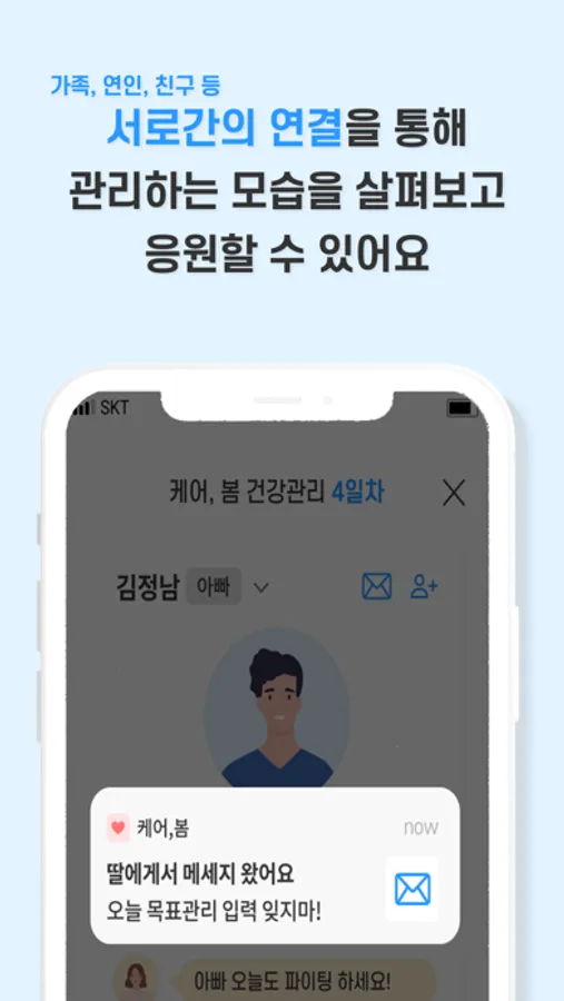 가족,친구,연인과 서로 연결을 통해서 기록하는 상황을 바라보고, 응원 메세지도 남길 수 있어요:)