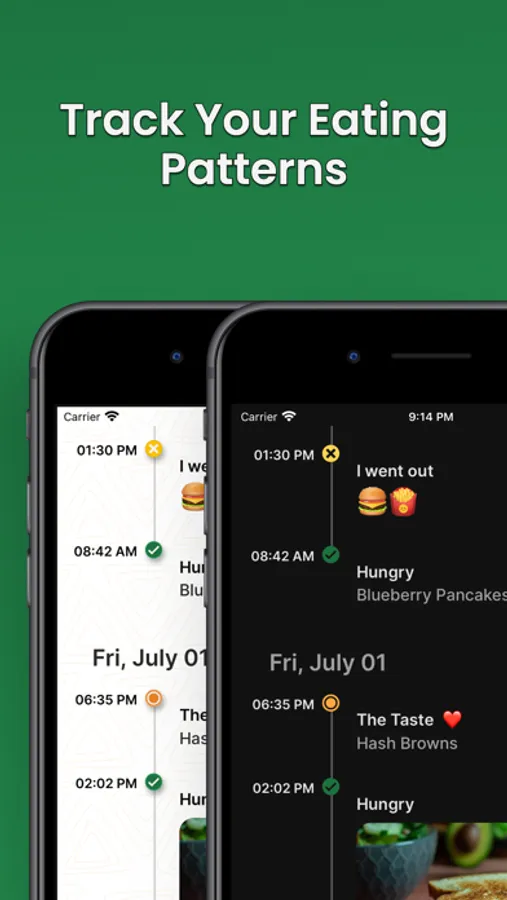 Eating Buddy features a comprehensive timeline, showcasing your hunger states, the meals you ate, their reasons, and a symbol for your post-meal state - letting you quickly decipher when you're on track and not.